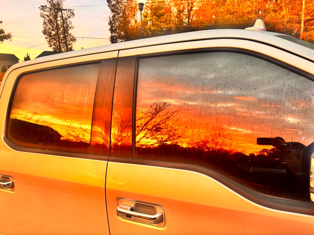 This is this morning’s sunrise reflected in our truck’s windows. I wrote a little poem for it: